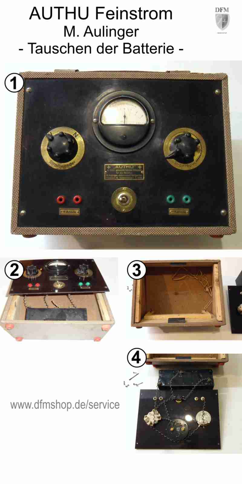 Der Zugang zum Batterie-Element geschieht über den Boden des Gehäuses. Das Galvanische Element ist im Originalzustand sehr groß und schwer und lieferte 24 Volt Spannung. Häufig wurden zu dieser Zeit die Geräte ohne Metall- oder Kohleschicht-Widerstände aufgebaut. Mittels des Wahlschalters kann wie folgt geschalten werden: